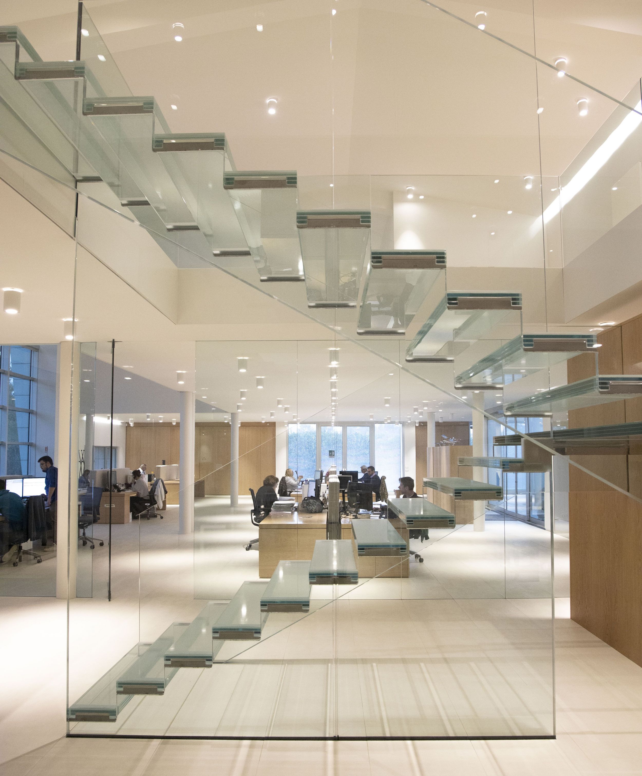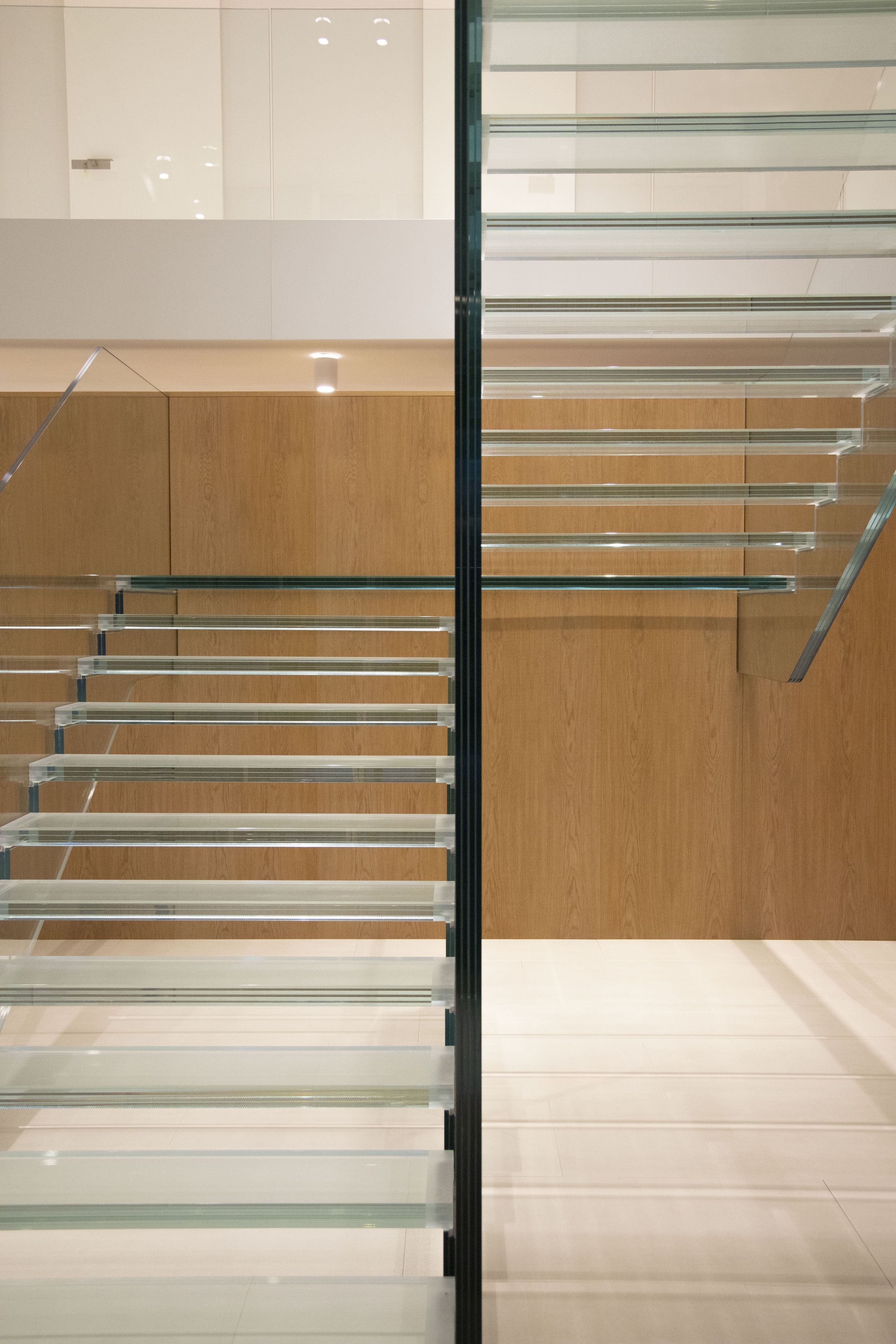 Further to a profound study in this area Monica Armani Studio designed and built this glass staircase without a single screw; where all the glass components are adhered one to the other, effectively highlighting the singularity, materiality and beauty of the glass and its design.