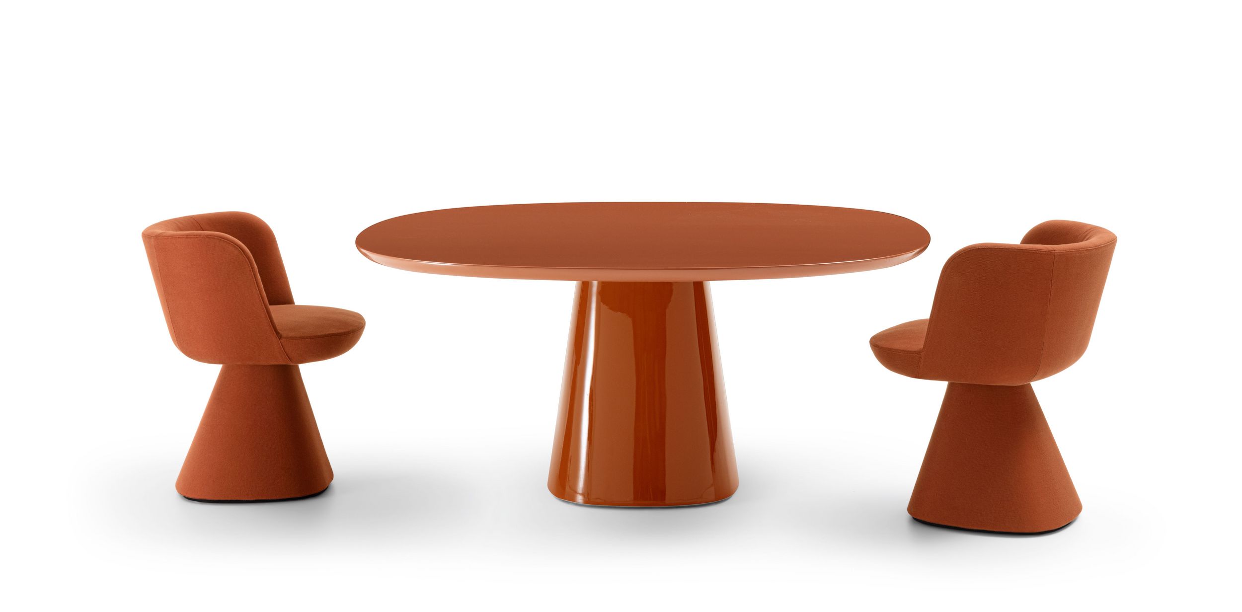 The complementary, fully upholstered Flair O' armchair, sits on the same conical base with a swivel feature that conveniently boasts an automatic return mechanism. Sophisticated yet understated, Flair O' is perfect in its supporting role opposite Allure O'.