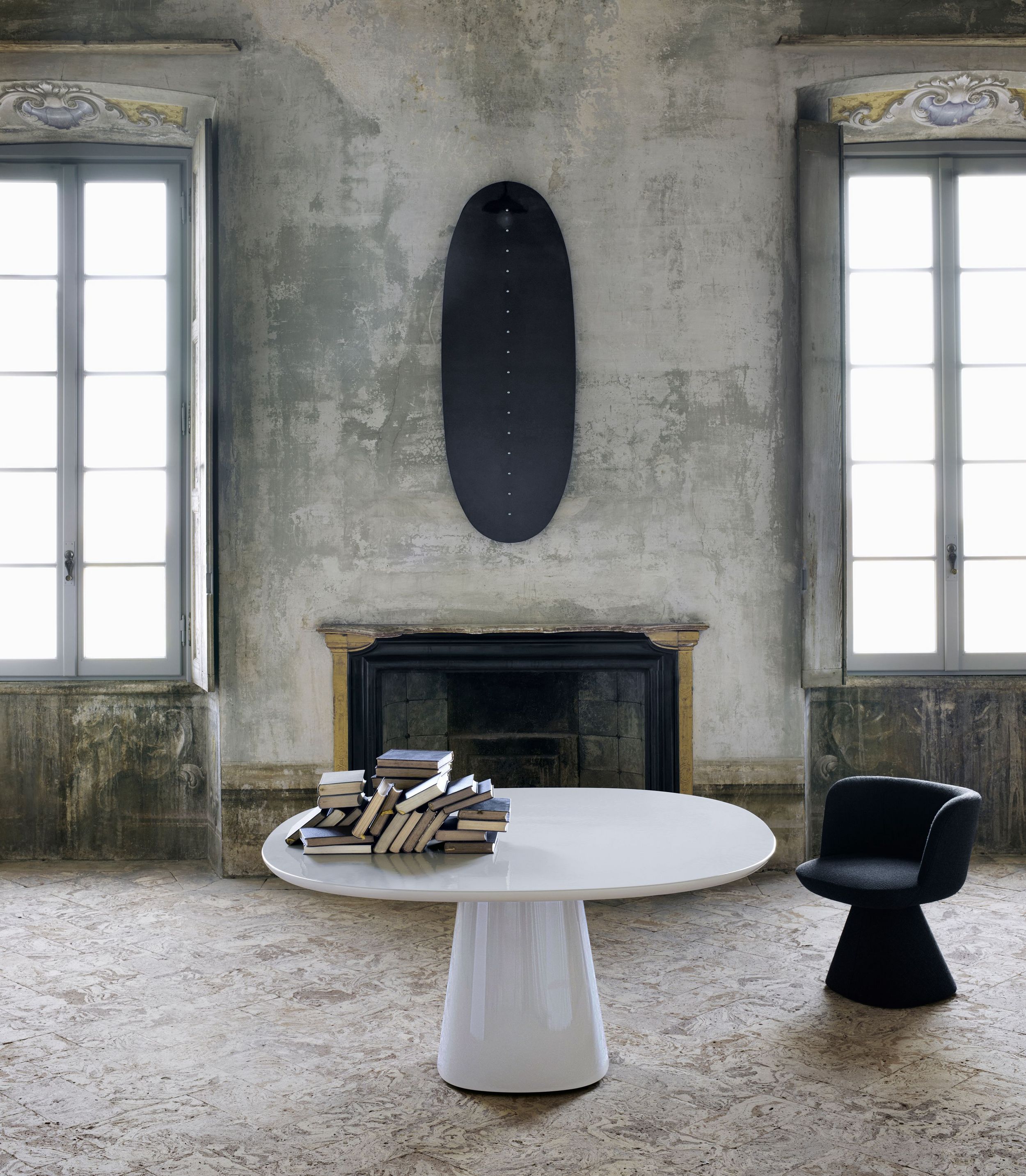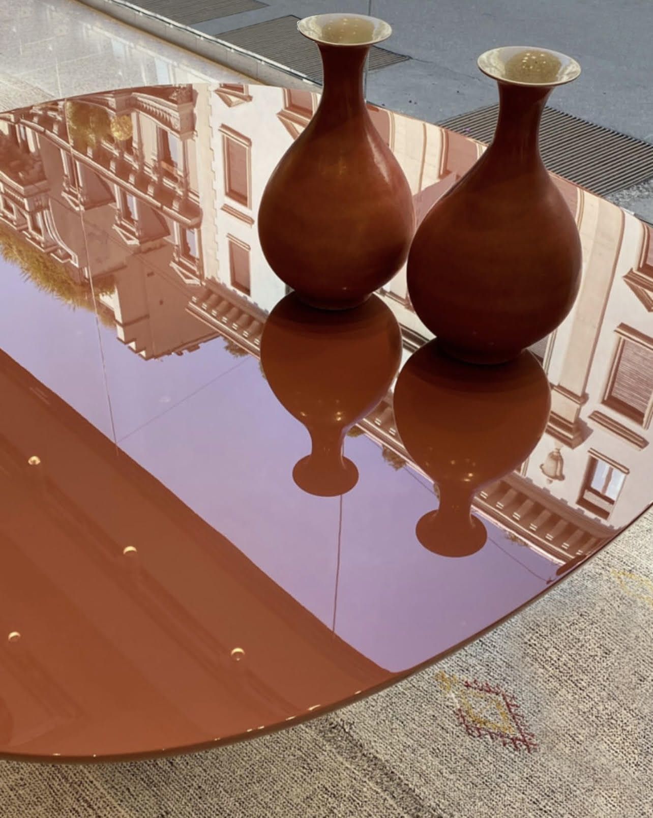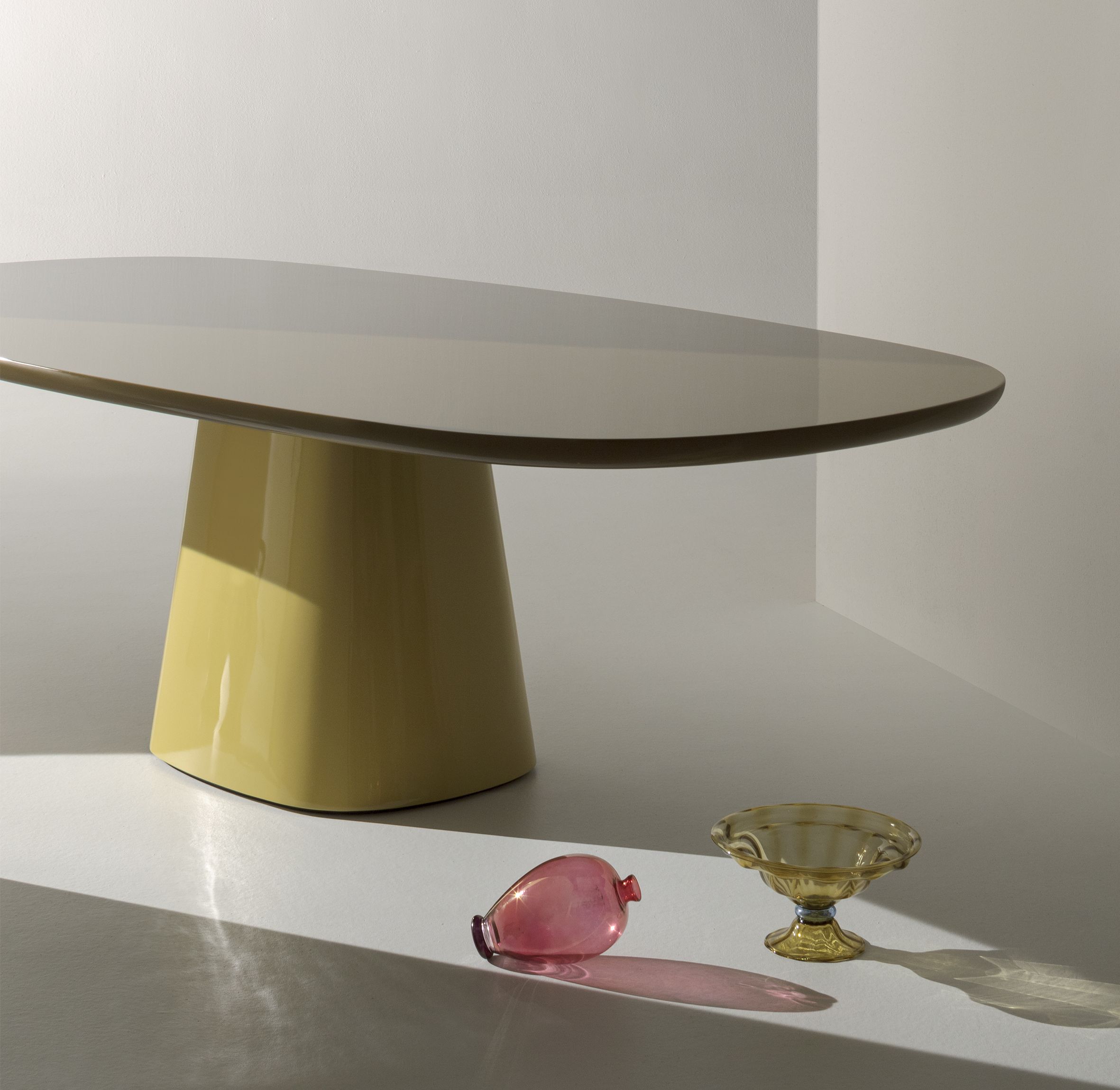 In an homage to Jackie O' and her glamourous and iconic style, Monica Armani drew inspiration from the shape of her dramatic sunglasses to create a dining table and complementary chair. Allure O' is a dining table of shapely lines, of curves in all the right places, of volume, scale and balance. It is a contemporary celebration of 60's style, unadorned sculpture and functional design. Powerful and serene, Allure O' gracefully floats on a perfectly proportioned tapered base. Available in two sizes, glossy or mat finishes, in a stunning array of colours, the table and base can be one solid colour or mixed and matched, and also can be enhanced with a slab of Carrara white marble, Marquina black marble, or black glass.