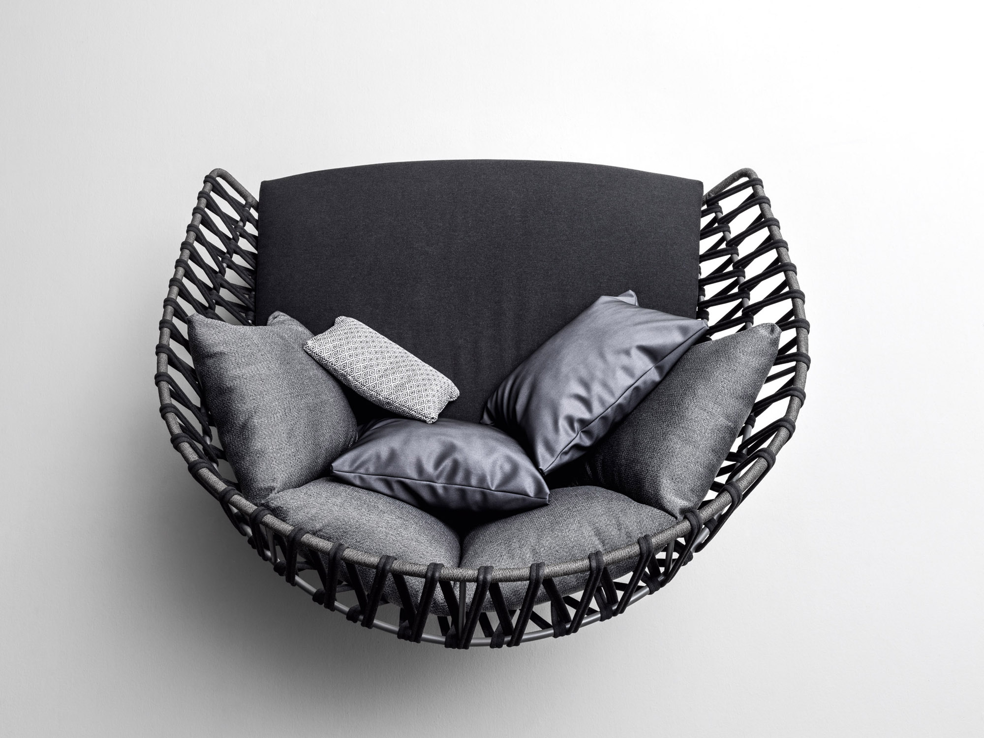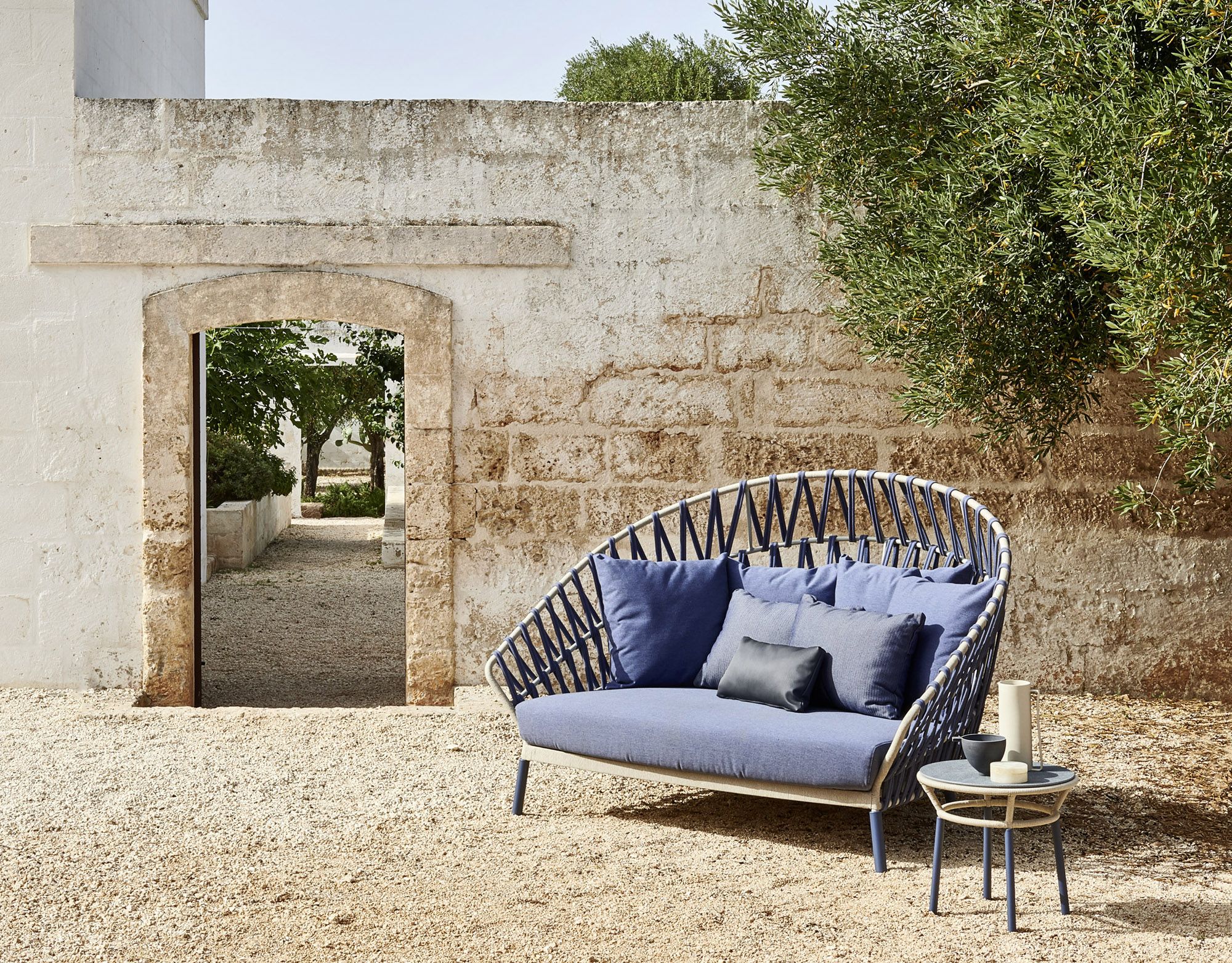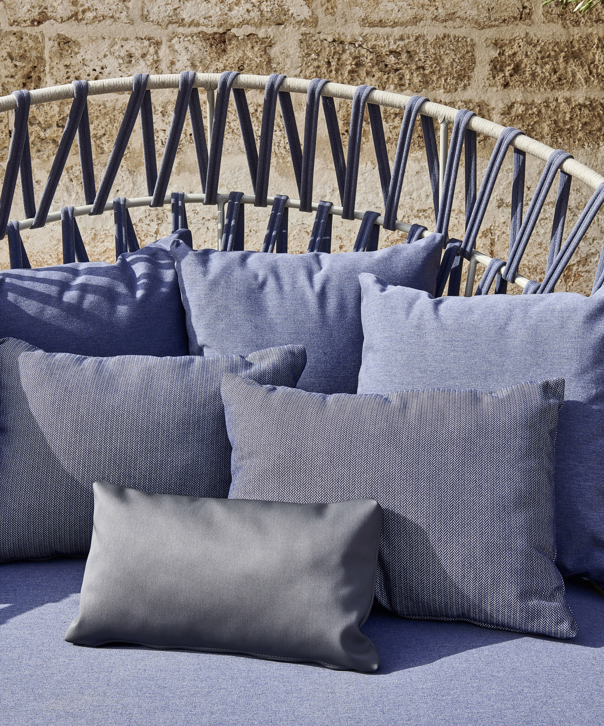 Emma Cross, by Monica Armani for Varaschin, represents a collection of strength and delicacy, comfort and elegance. Emanating from the original Emma family of outdoor, Emma Cross brings a characteristically innovative weave to a collection designed with superlative comfort in mind. Acrylic fabric strips are artistically wrapped around a light weight aluminum structure, the effect of which provides an unexpected quality of lightness in a serene yet joyful colour palette. Seating in its basket-shaped wide-open weave is airy and welcoming; a perfect fit.