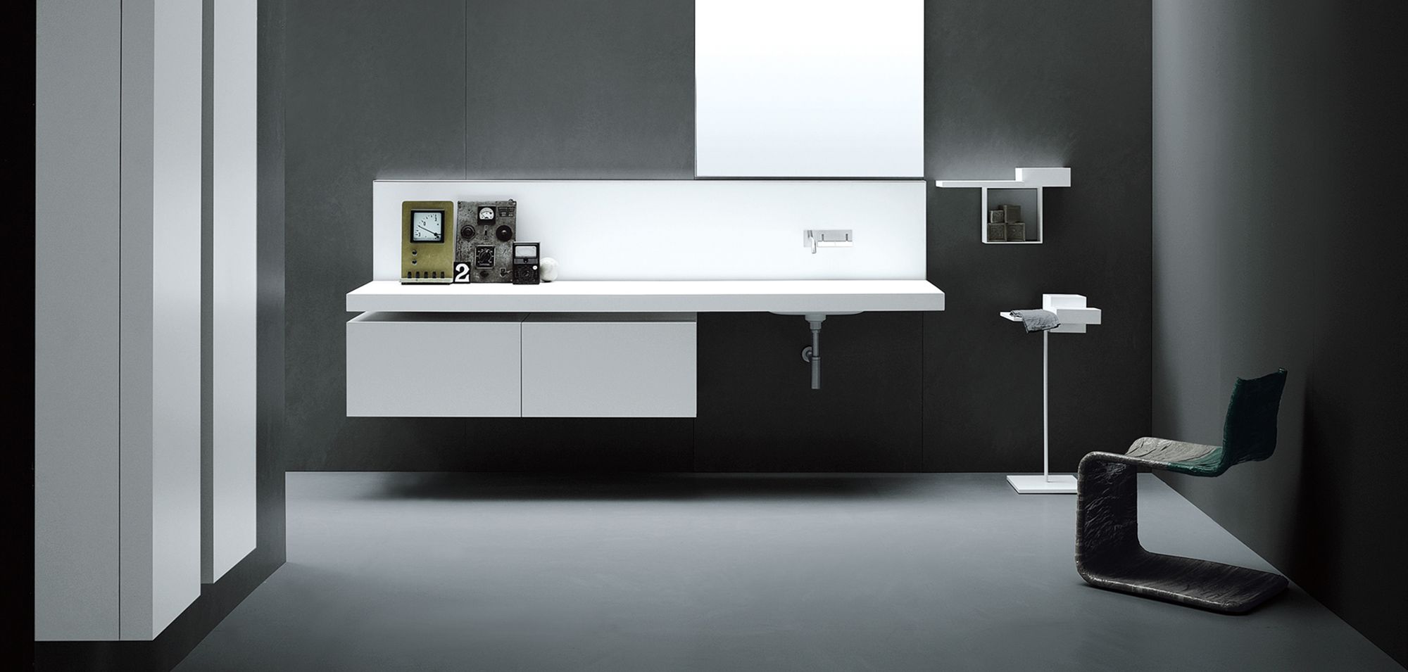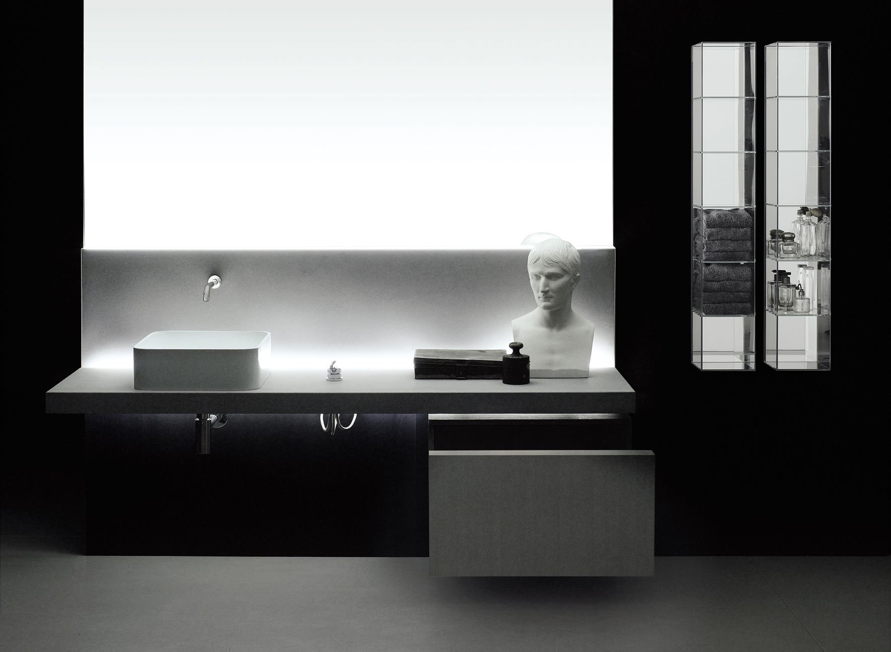 Monica Armani designed the minimalist and contemporary Pianura for Boffi as an open and elegant bathroom system offering cabinets and recessed linear lighting that together combine to visually 'float' in space. Doors and drawer units complement and complete the collection.