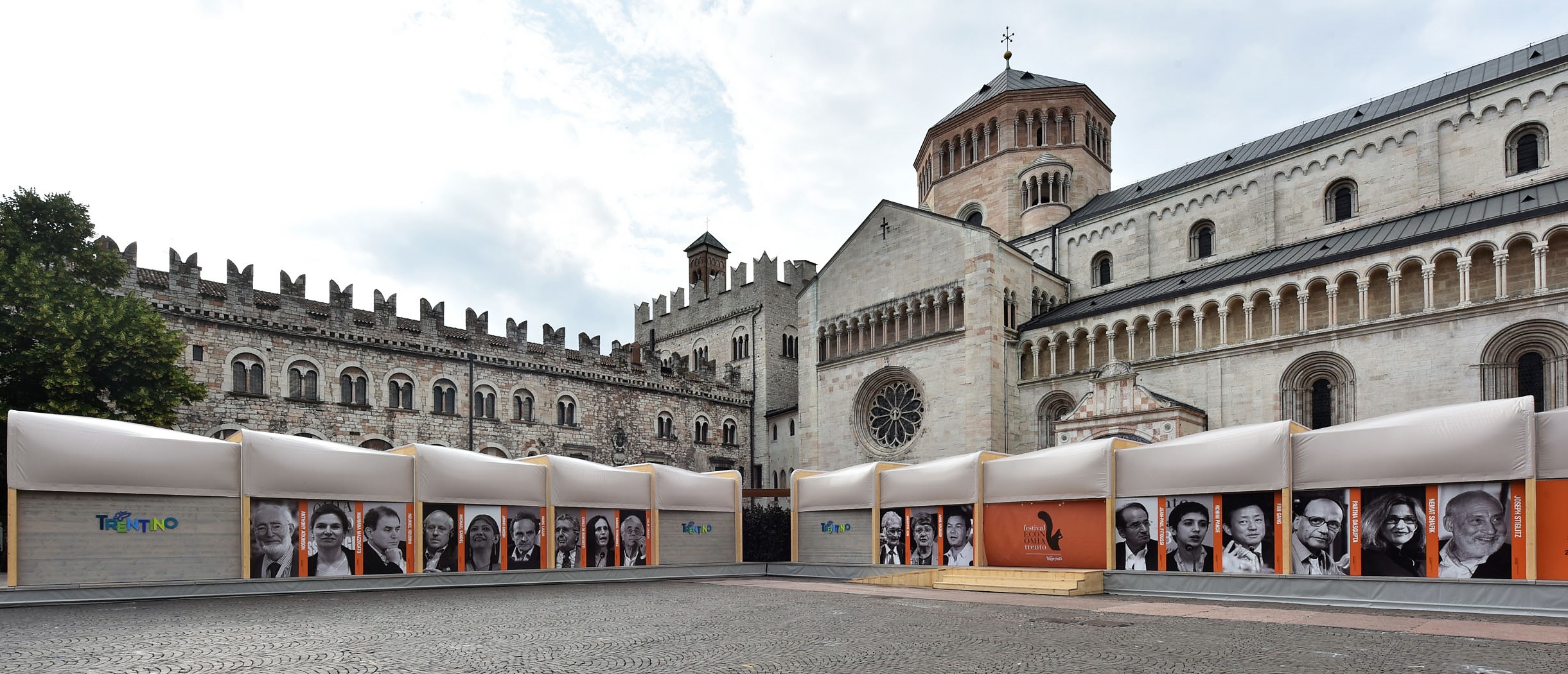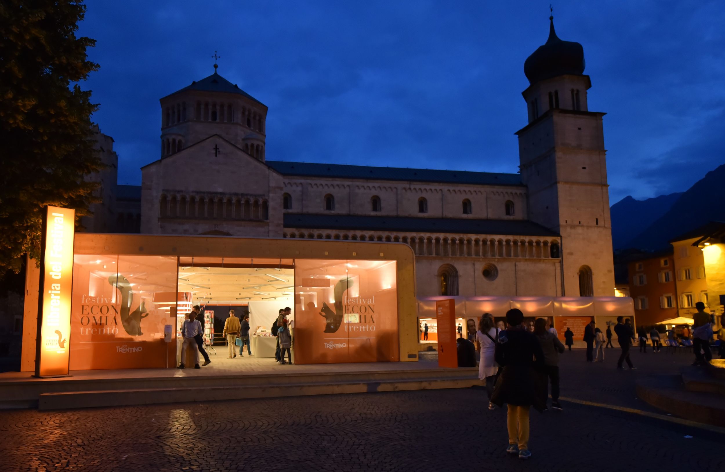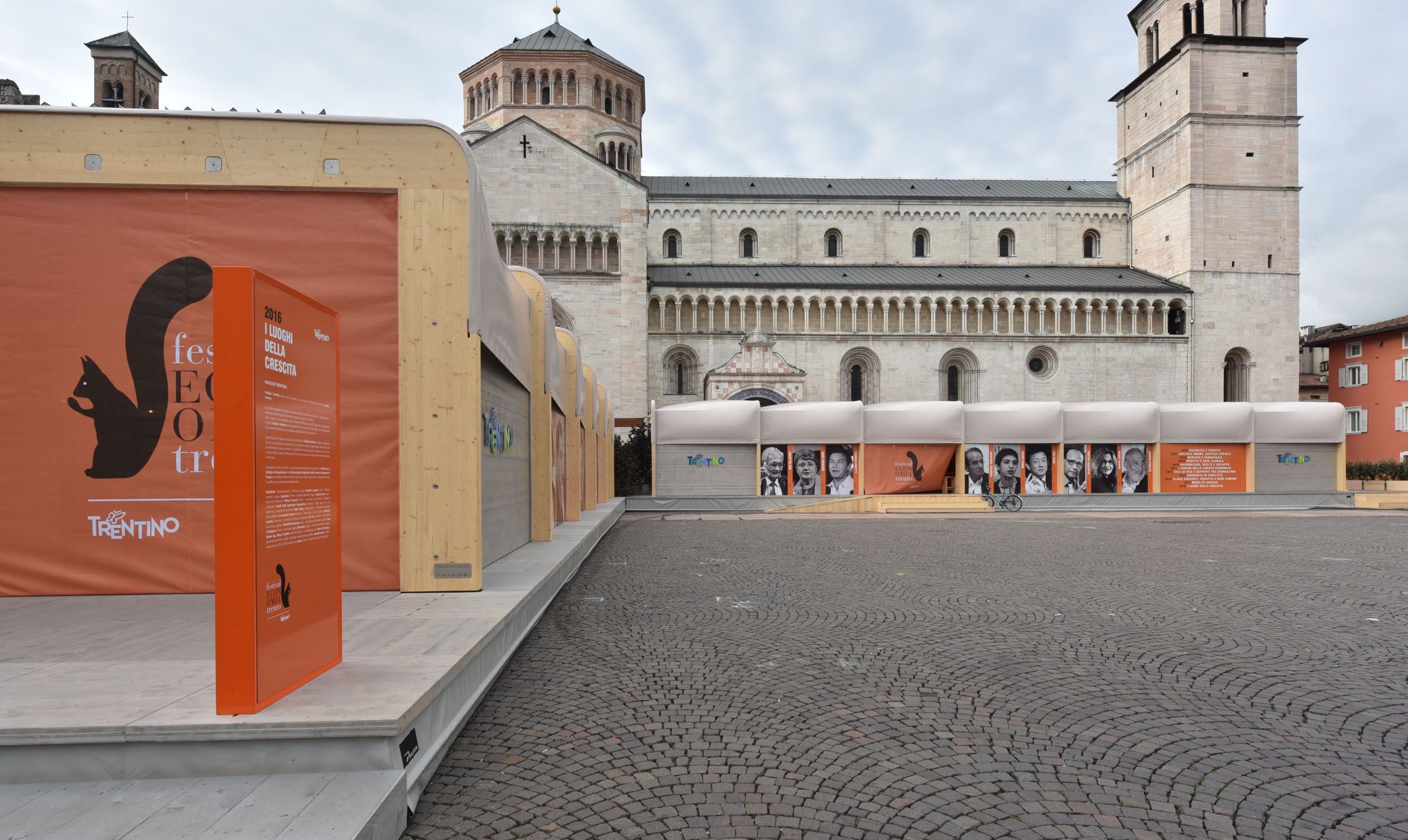 Designed by Studio Monica Armani for the Trento Festival of Economics to complement the majesty of the city's Piazza del Duomo, Pavilion Trentino housed the bookshop and served as host to various communication events.