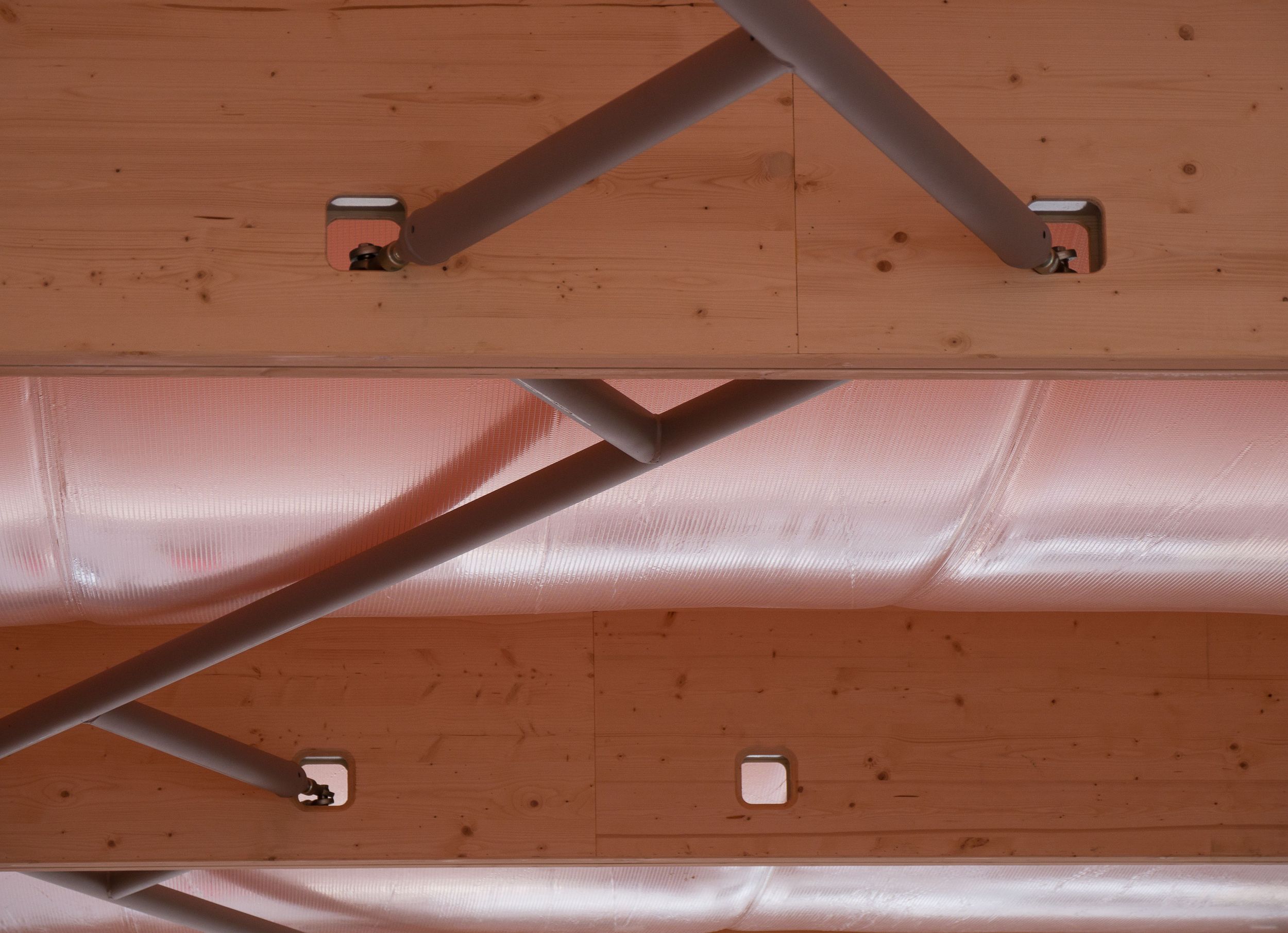 From inside the Pavilion looking up are hints of the legendary ‘enrosadira’ of the Dolomites, when the natural light of sunrise and sunset transforms the mountain landscape into hues of pinks, reds and purples, like the colours of a 'garden of roses'.